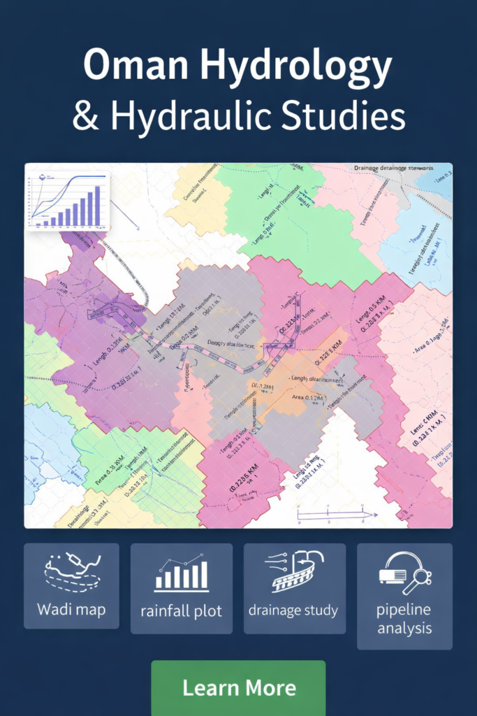 Professional hydrology and hydraulic solutions including wadi analysis, drainage design, culvert sizing, flood risk assessment, and protection works.